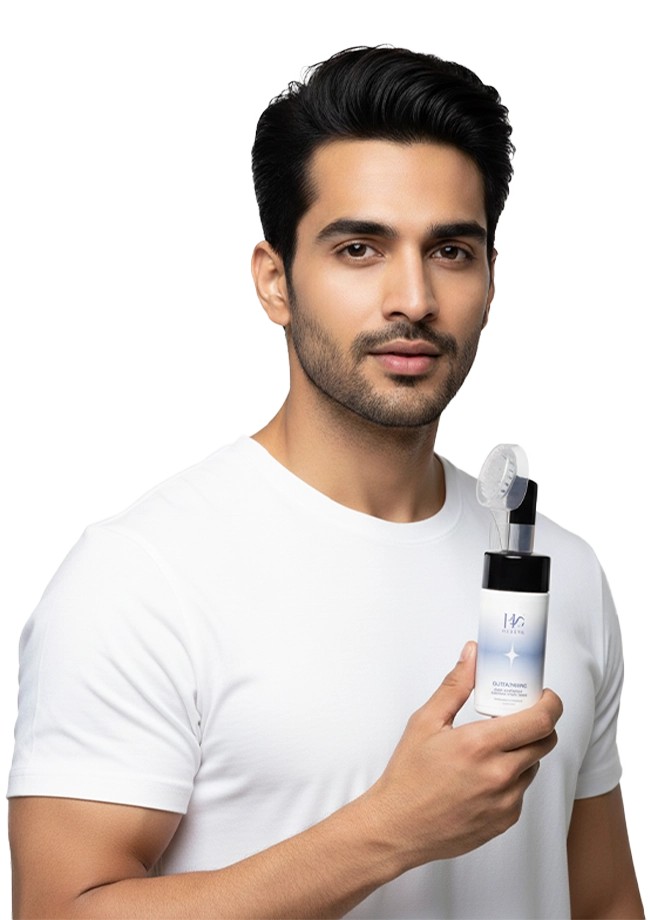 Glutathione-powered foam that fades pigmentation and unclogs pores. Clean, bright skin in one wash. For all genders.